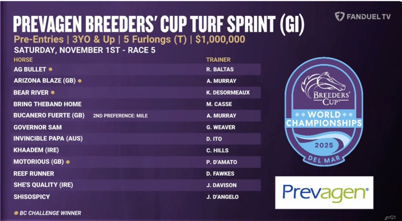 Ag Bullet (Richard Baltas) 7-2 Nicole Russo: Owns huge win two back in G1 Jaipur. Motorious (Phil D'Amato) 4-1 Nicole Russo: Second by a neck, on course he loves, in 2024 Turf Sprint. Arizona Blaze (Adrian Murray) 6-1 Nicole Russo: Second in 2024 Juvenile Turf Sprint, he is a three-time group winner this year. Reef Runner (David Fawkes) 8-1 Nicole Russo: Disqualified in Green Flash, got win outright in Eddie D. Big Mojo (Mick Appleby) 10-1 Nicole Russo: Game fourth while in tight in 2024 Juvenile Turf Sprint; eyes return to Del Mar off big score. Khaadem (Charlie Hills) 12-1 Nicole Russo: Quirky 9-year-old was last to first at Keeneland. Shisospicy (Jose D'Angelo) 12-1 Nicole Russo: Speedy filly bounced back well from Royal Ascot trip. Bear River (Keith Desormeaux) 15-1 Nicole Russo: Coming off two wins against solid company. No Nay Hudson (Wesley Ward) 15-1 Nicole Russo: Bothered at break, up wide for Woodbine win. She's Quality (Jack Davison) 15-1 Nicole Russo: Again ran fine race in defeat behind star Asfoora. Others: Bring Theband Home, Bucanero Fuerte, Danon McKinley, Durante, Frost At Dawn, Governor Sam, Invincible Papa, June Blair