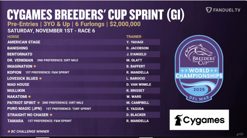 Bentornato (Jose D'Angelo) 3-1 MW: Last year's Sprint runner-up came back looking as good as ever in '25 bow Kopion (Richard Mandella) 4-1 2nd (F&M Sprint preferred) Mike Welsch: Likely to be cross-entered in both Sprint/FM Sprint but leaning toward latter Imagination (Bob Baffert) 6-1 Mike Welsch: Snapped long win drought, looked good doing it in SA Sprint Straight No Chaser (Dan Blacker) 6-1 Mike Welsch: Defending Sprint champion should benefit from effort in SA Sprint Championship Mullikin (Rodolphe Brisset) 8-1 Mike Welsch: Toss last and has credentials to fit with this group at his best Lovesick Blues (Librado Barocio) 10-1 Mike Welsch: Prepped for Sprint with solid effort over SA turf Banishing (David Jacobson) 15-1 Mike Welsch: Trainer feels sprinting is what this guy does best Nakatomi (Wesley Ward) 15-1 Mike Welsch: Perhaps third time will be the charm for veteran in BC Sprint Dr. Venkman (Mark Glatt) 20-1 1st (Dirt Mile 2nd preference) Mike Welsch: Both Sprint and Dirt Mile remain on the table Patriot Spirit (Michael Campbell) 20-1 1st (Dirt Mile 2nd preference) Mike Welsch: Became stakes winner, earned automatic berth for his victory in Vosburgh American Stage (Yoshito Yahagi) Mad House (David Van Winkle) Puro Magic (Shogo Yashuda) 2nd (Turf Sprint preferred) Tamara (Richard Mandella) 2nd (F&M Sprint preferred) -------------------------------- Big City Lights (Mandella) Whatchatalkinabout (Ward) Valiant Force (Murray)