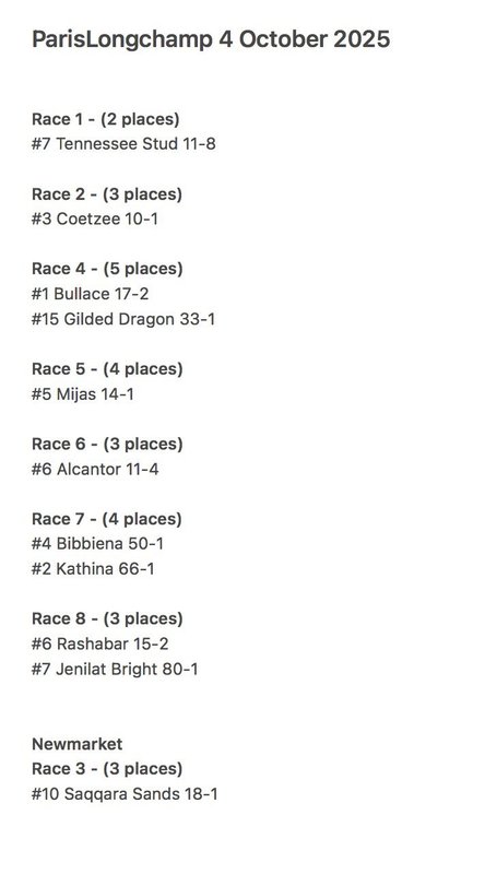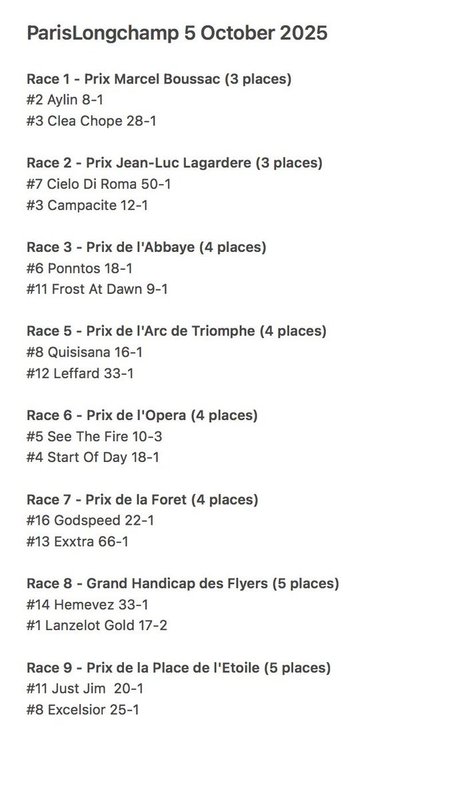 2 G1s on a competitive days racing - also throw in a great each way bet from the G1 in Newmarket today. Then all focus goes to the big day tomorrow. Bonne Chance 🤞 ![]()