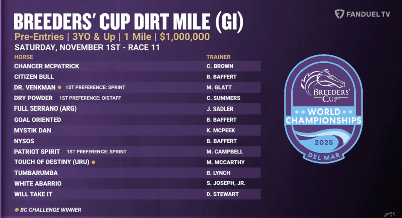Nysos (Bob Baffert) 2-1 Mary Rampellini: Serious drill Oct. 12 - working three-quarters in 1:11.20; unbeaten at DMR Full Serrano (John Sadler) 9-2 Mary Rampellini: Rosario has mount in BC, per Sadler; rider was aboard for last year's win Mystik Dan (Kenny McPeek) 8-1 Mary Rampellini: He has put up three triple-digit Beyer Speed Figures from six starts in 2025 Citizen Bull (Bob Baffert) 10-1 Mary Rampellini: Wired field in 2024 Juvenile at DMR; worked in 1:11 and change Oct. 12 White Abarrio (Saffie Joseph Jr.) 10-1 Mary Rampellini: 2023 BC Classic winner looks to add Dirt Mile to extensive resume Chancer McPatrick (Chad Brown) 15-1 Mary Rampellini: He might get an ideal pace setup in the Dirt Mile; working at SAR Dr. Venkman (Mark Glatt) 15-1 2nd (Sprint preferred) Mary Rampellini: Glatt said BC Challenge winner likely to be pre-entered in Dirt Mile, Sprint Touch of Destiny (Michael McCarthy) 20-1 Mary Rampellini: He's both unbeaten and untested in six outs; makes first start outside Uruguay Tumbarumba (Brian Lynch) 30-1 Mary Rampellini: Back on the work tab off Ack Ack, going a sharp half-mile on Oct. 11 at CD Goal Oriented (Bob Baffert) Will Take It (Dallas Stewart) Dry Powder (Chad Summers) 2nd (Distaff preferred) Patriot Spirit (Michael Campbell) 2nd (Sprint preferred)