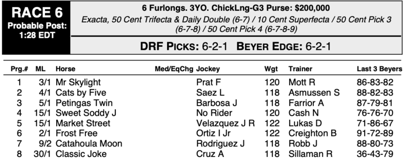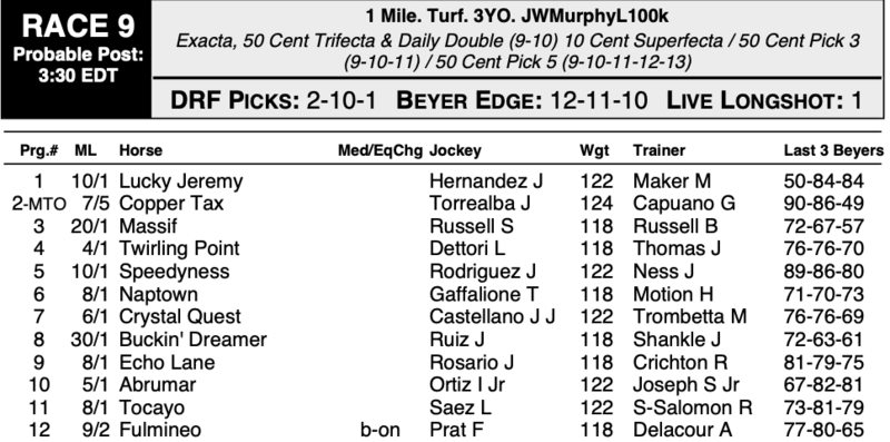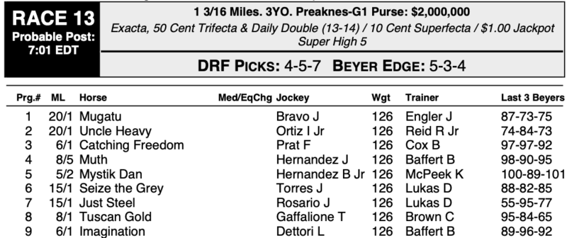1: Mugatu 20-1 2: Uncle Heavy 20-1 3: Catching Freedom 7-2 4: Muth SCR 5: Mystik Dan 8-5 6: Seize the Grey 12-1 7: Just Steel 12-1 8: Tuscan Gold 9-2 9: Imagination 3-1