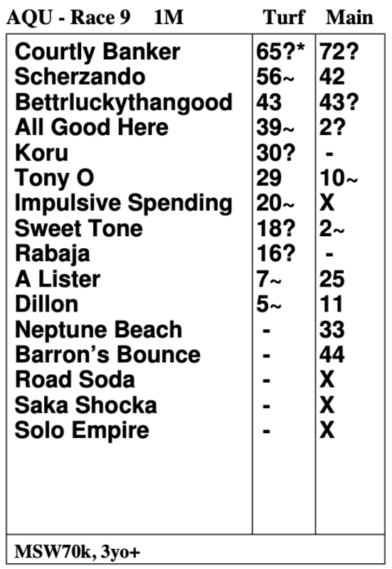 Default 4/26-27 (AQU): Scherzando AE Friday; Forced long Saturday